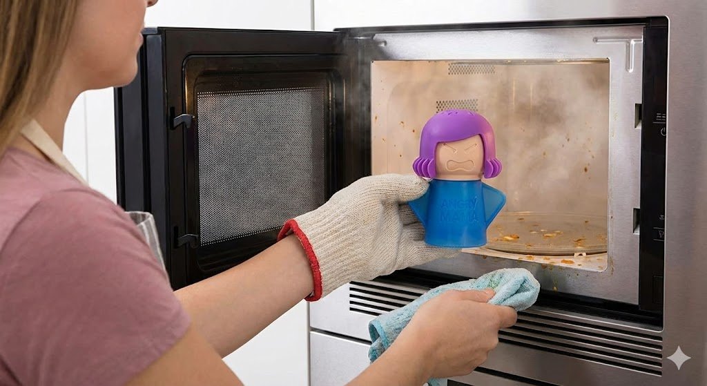 Cleaning the microwave is usually a nightmare of scrubbing dried sauce. The Angry Mama changes that. You fill her with vinegar and water, microwave her for 7 minutes, and steam comes out of her head to soften all the grime.
