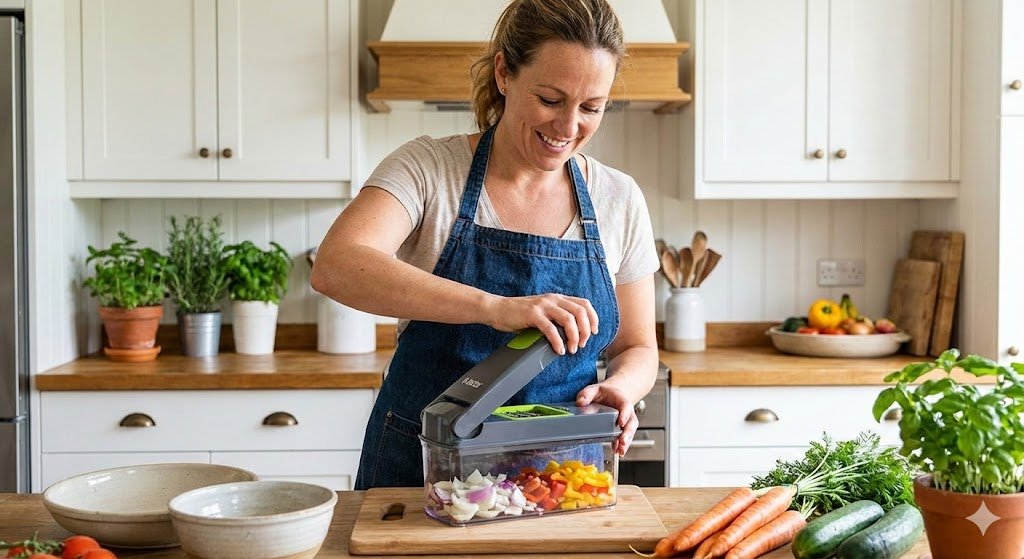 If you hate chopping onions because of the tears or the time it takes, you need this. It is the number one time-saver in my kitchen. You literally place the veggie on the blade, shut the lid, and boom—perfectly diced vegetables in one second.
